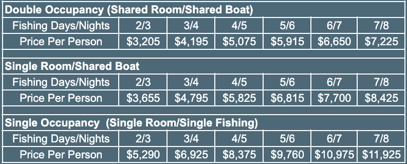 INCLUDED: Fishing, Lodging, All Meals, Non-Alcoholic & Alcoholic Bevs, Airport/Marina Transfer