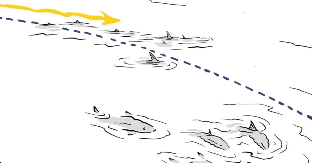 In lieu of a clear visual of the fish, a school of cruising bonefish will often create a wake on the surface in sizes corresponding to how many fish are in the school. If the school is cruising very slowly and actively feeding, the wake may appear more as nervous water (shimmering, choppy, or rippled water with a higher frequency or vibration than its surrounding water) than a classic wake in the shape of a V. In skinny water, the same school may reveal itself further when the tails and dorsal fins of the fish break the surface. We may also see parts of them more readily than the fish themselves; premonitions of the fish. We may see a tail or a dorsal fin breaking the surface, catch the nose of a fish sliding across a light spot on the flat, or perhaps the rear-half of a fish as it swims over turtle grass.