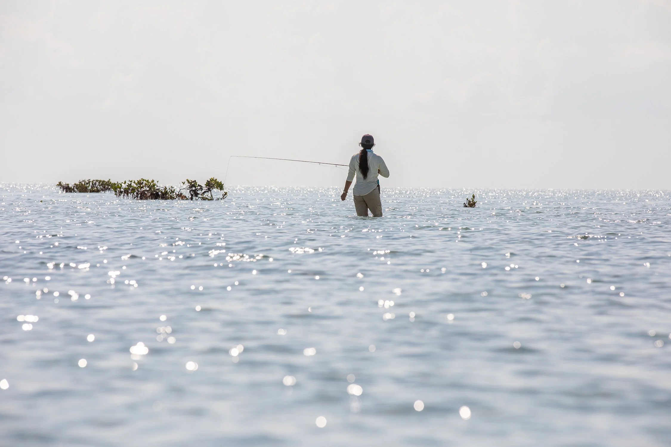 As you strip line off the reel, let it fall onto the water, and do your best to ensure that it doesn’t get caught on your feet, fishing pack, a mangrove shoot, or anything else. As you wade, the line will lay behind you, and you’ll want to check on it frequently to make sure that it remains tangle-free. If your line comes off the reel in twists or coils, take the time to remove the twist, or stretch the line to remove any memory; ask your guide for help here, if need be. Once you have an appropriate amount of line out, grab your leader just above the fly with your line hand, keep a finger of your rod hand on the fly line, and begin wading.